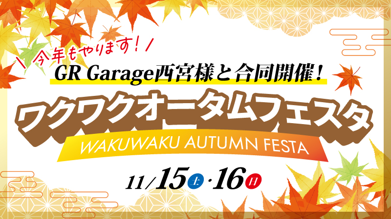 GR Garage西宮様と合同イベント「ワクワクオータムフェスタ」を11/15(土)16(日)にて開催いたします!トークシ...