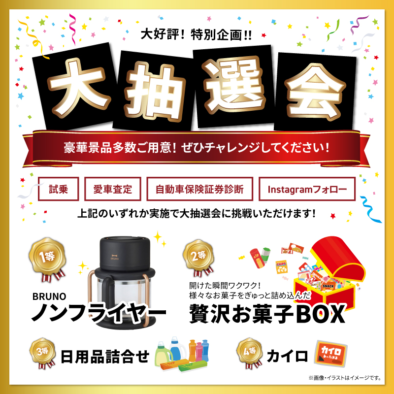 試乗・愛車査定・自動車保険証券診断・Instagramフォローのいずれか実施で抽選会に挑戦いただけます。