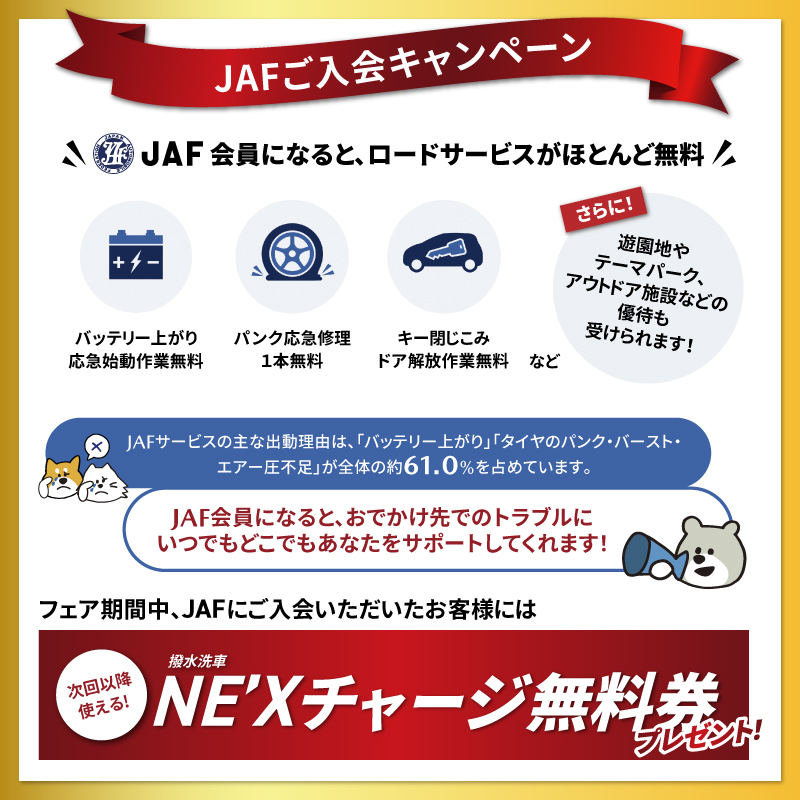 フェア期間中、JAFにご入会いただいたお客様には、次回以降使える撥水洗車「NE’Xチャージ無料券」プレゼント!