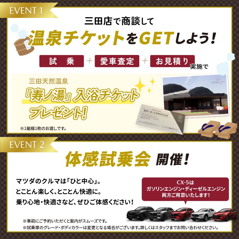フェア期間中、「試乗」+「愛車査定」+「お見積り」実施で、三田天然温泉”寿の湯”の入浴チケットをプレゼント!