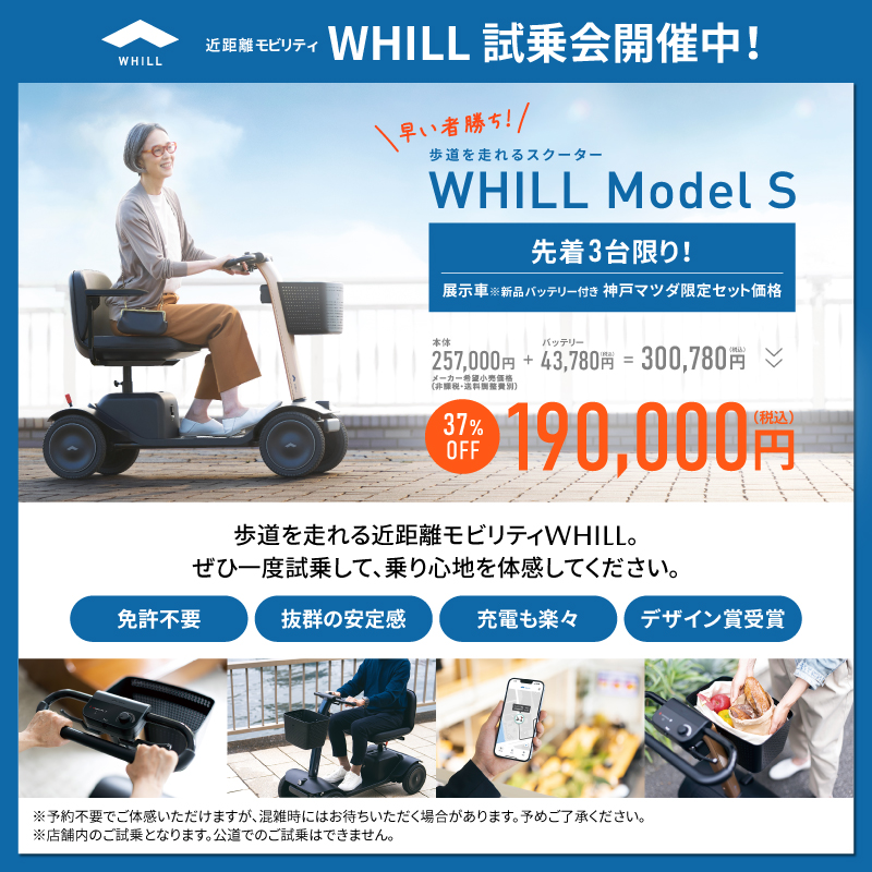 今なら「WHILL Model S」展示車に新品バッテリーを付けて、神戸マツダ特別セット価格でご提供!この機会をお見逃しなく!