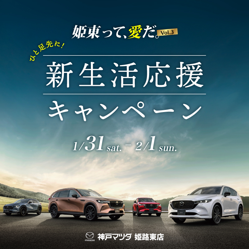 神戸マツダ姫路東店では、1/31(土)2/1(日)の2日間「姫東って、愛だ。Vol.3~新生活応援キャンペーン~」を開催いたします!