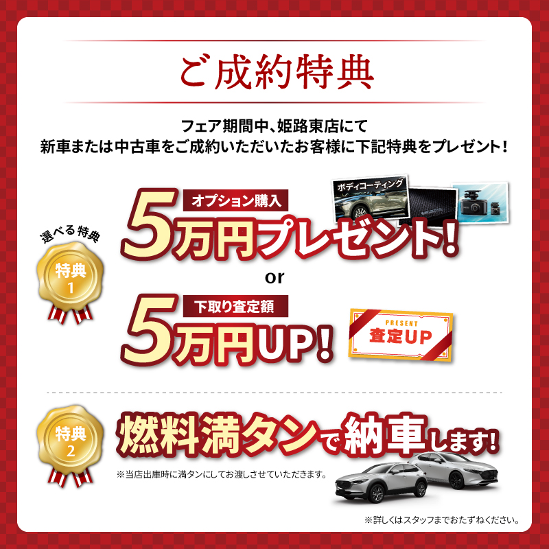 フェア期間中、姫路東店にて新車または中古車をご成約いただいたお客様には