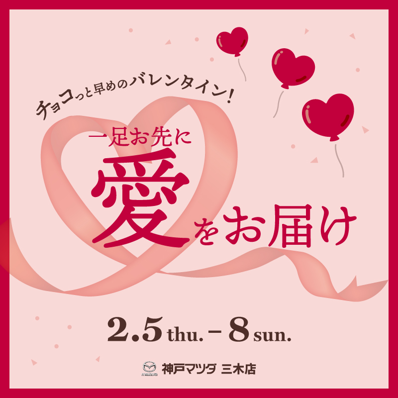 神戸マツダ三木店では、2/5(木)~8(日)の期間「チョコっと早めのバレンタイン!一足お先に愛をお届け」イベントを開催いたします!