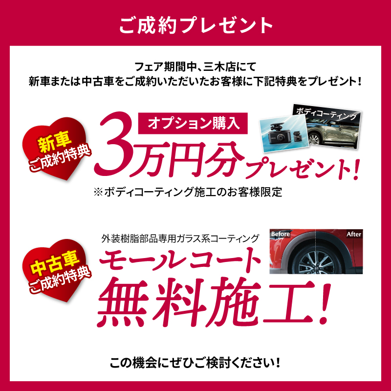 フェア期間中、三木店にておクルマをご成約いただいたお客様には下記特典をご用意いたしました!