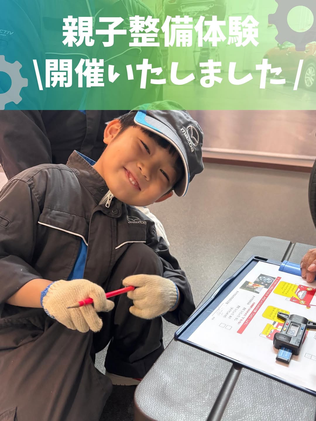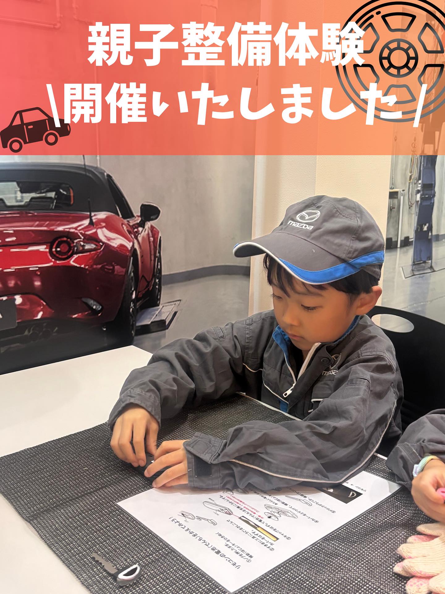 マツダ整備士のユニフォームを着て、ディーラー整備士になった気分!親子でクルマの整備を体験できます。