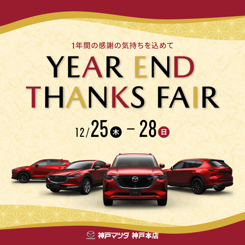 神戸マツダ神戸本店にて、12/25(木)~28(日)の期間、「YEAR END THANKS FAIR」を開催いたします!