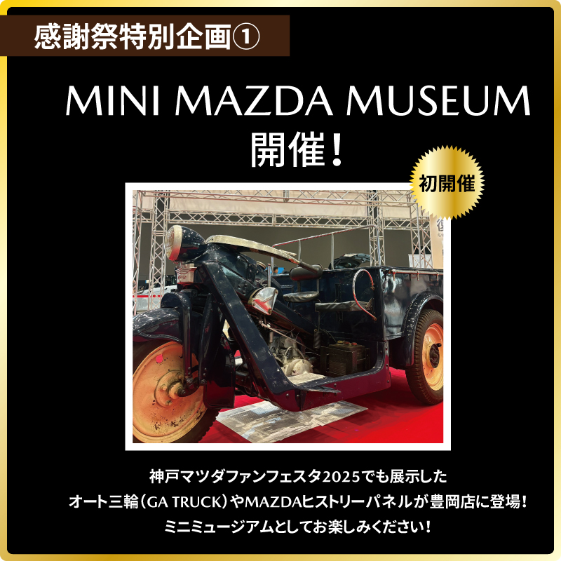 神戸マツダファンフェスタでも展示したオート三輪やMAZDAヒストリーパネルが豊岡店に登場します。