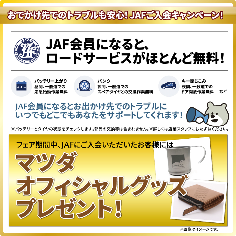 フェア期間中、当店にてJAFへご入会いただいたお客様に「マツダオフィシャルグッズ」をプレゼント!