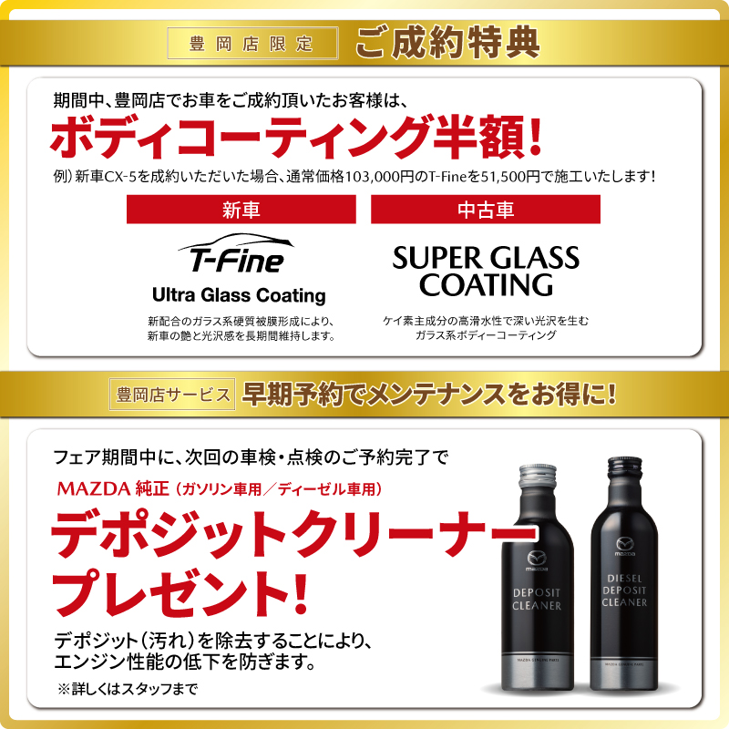 フェア期間中、豊岡店で新車をご成約いただいたお客様には、「ボディコーティングを半額」にてご提供!